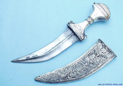 This antique is called the Jambiya. It is the Arabic term for dagger, it is a type of dagger with a short curved blade that is worn on a belt. Although the term jambiya is also used in other Arab countries, it is mostly associated with people of Yemen. Men typically above the age of 14 wear it as an accessory to their clothing. It comes with a "home" for the dagger, all in one price! This particular Jambiya is plated with silver metal to give it a mid-evil feel.